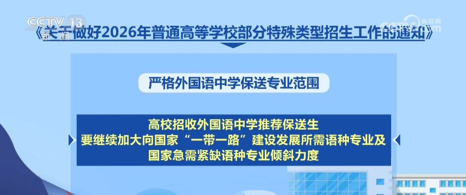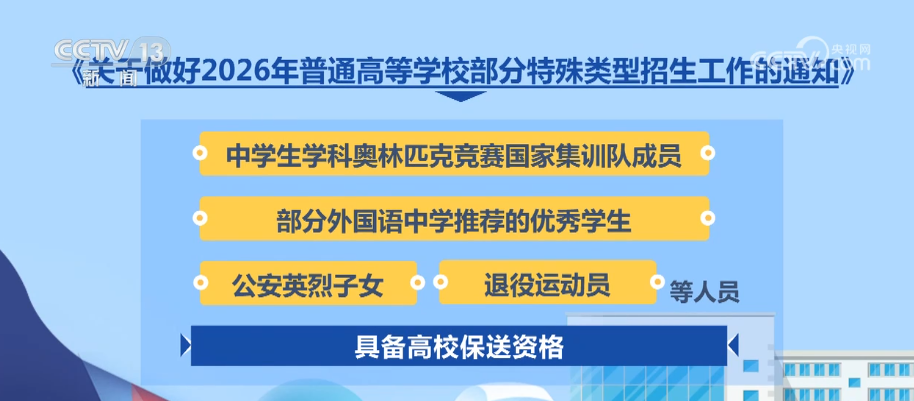 央視網(wǎng)消息:日前,教育部印發(fā)《通知》,部署做好2026年普通高校部分特殊類型招生工作。普通高校特殊類型招生主要包括藝術(shù)類專業(yè)招生、高水平運(yùn)動(dòng)隊(duì)招生、保送生、綜合評(píng)價(jià)招生4類。